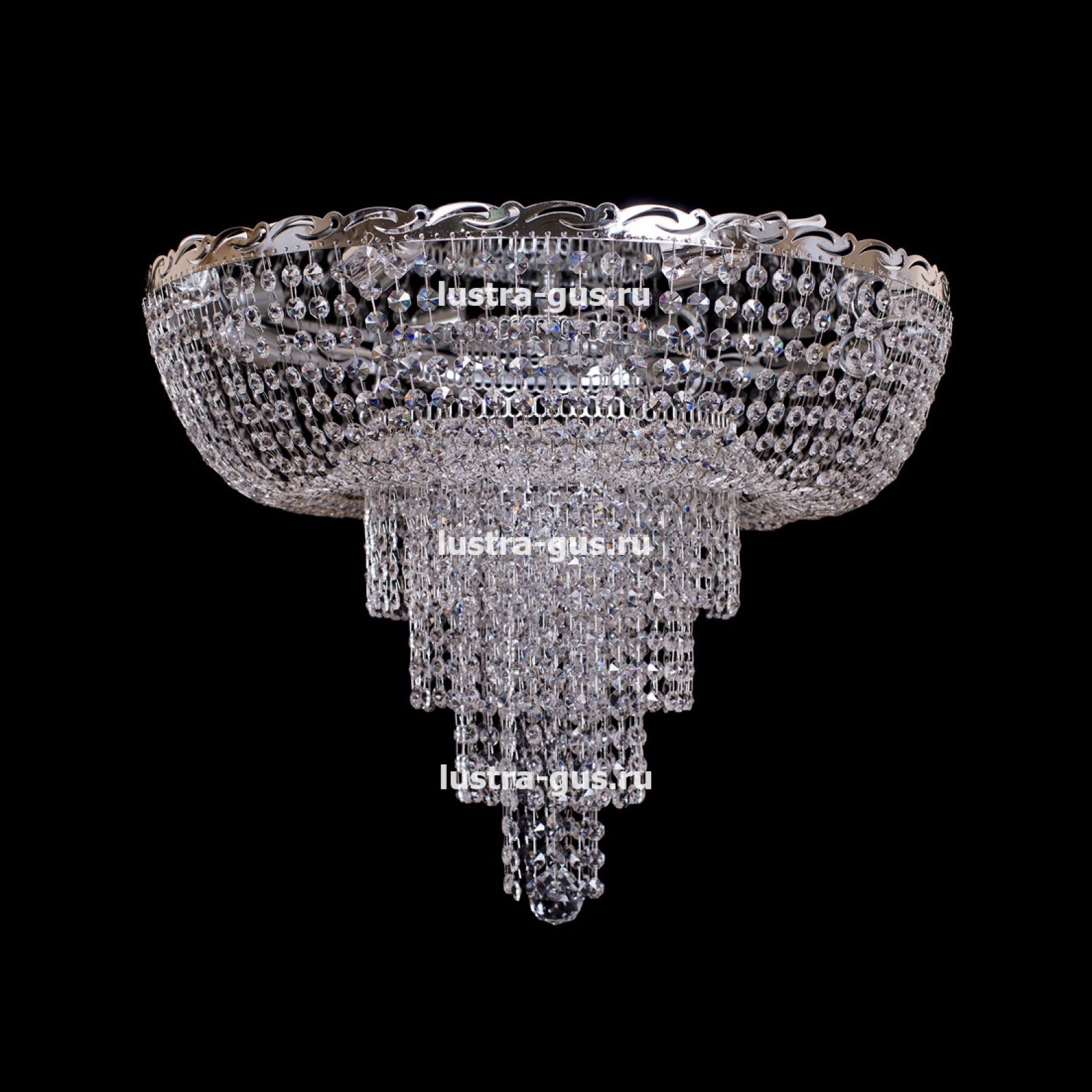 Потолочная люстра Анжелика пирамида обтикон от российского производителя светильников Гусь-Хрустальный идеально подойдет для освещения зала, гостиной, спальни. Люстра выполнена в классическом стиле с изящными хрустальными подвесками. Арматура светильника выполнена из металла, цоколь - E27. Цвет арматуры - золотой или серебристый, на выбор. В основании люстры расположено зеркало, которое отражает свет и усиливает освещенность комнаты.